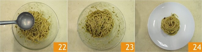 Mexa para misturar a massa, adicionando, se necessário, uma concha de água de cozimento 22 23. Prato os spaghettoni formando um ninho 24.