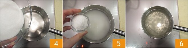 Em uma panela pequena, coloque água, açúcar 4 e sal 5. Leve à fervura para que o açúcar e o sal se dissolvam completamente 6.