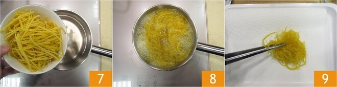 Assim que a calda atingir a fervura, adicione as cascas de limão 7 e deixe ferver por cerca de 8-9 minutos 8. Escorra em um pano 9 e coloque na geladeira.
