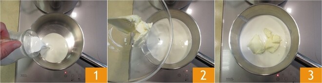 Para preparar os spaghettoni com fonduta de scimudin, a primeira coisa a fazer é colocar no fogo uma panela cheia de água salgada, que servirá para cozinhar a massa. Agora, passe para a fonduta: despeje em uma panelinha o creme de leite 1 e a manteiga 2. Aqueça até atingir a fervura 3.