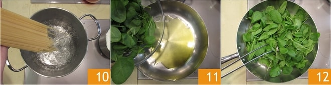 Cozinhe os spaghettoni na água que já atingiu a fervura 10. Enquanto isso, em uma frigideira quente, adicione um fio de azeite e os espinafres 11. Salteie-os por alguns minutos, sem deixá-los murchar completamente 12.
