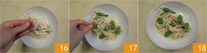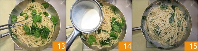 Quando o espaguete estiver al dente, escorra-o e transfira diretamente para a frigideira com os espinafres 13. Adicione também a fonduta 14 e salteie o espaguete 15.