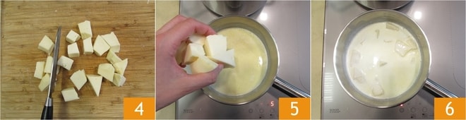 Enquanto isso, corte o queijo em cubos 4. Assim que o creme de leite atingir a fervura, desligue o fogo e deixe a temperatura baixar por cerca de 1 minuto. Adicione o scimudin ao creme de leite 5 e deixe descansar por alguns minutos 6. É importante deixar a temperatura do creme de leite baixar para não ocorrer outra coagulação do queijo.