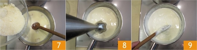 Adicione também o Parmesão ralado 7 e misture tudo com um mixer de imersão 8 para obter um creme homogêneo e aveludado.