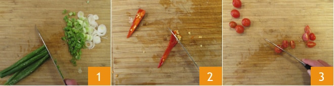 Para preparar o espaguete, comece limpando e fatiando o cebolinha e metade da parte verde 1. Em seguida, retire as sementes da pimenta 2 e corte os tomatinhos em quartos 3.