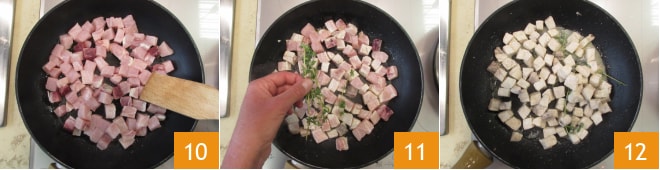 Salteie em fogo alto por cerca de 5 minutos 10, quando começar a dourar, adicione o tomilho 11 e assim que o fundo secar, reserve o espada 12.