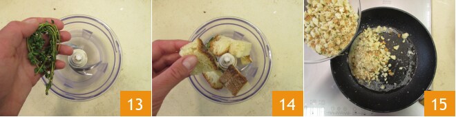 Prepare também a cobertura: no mixer, coloque o tomilho 13 e o pão em pedaços 14. Obtenha migalhas não muito finas e toste-as numa panela com um fio de óleo 15.