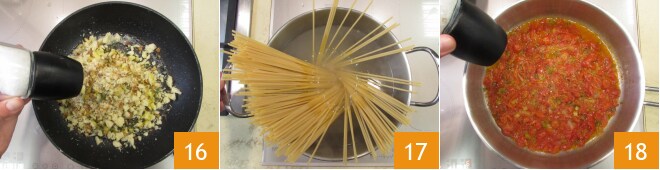 Adicione uma pitada de sal e deixe dourar, mexendo sempre 16. Você pode cozinhar o espaguete em água fervente e salgada e depois escorrer bem al dente 17. Enquanto isso, ajuste o sal do molho 18.