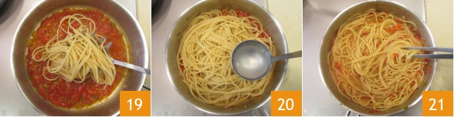 Escorra a massa na panela 19, adicione uma concha de água do cozimento e finalize o cozimento da massa 20, mexendo frequentemente 21.