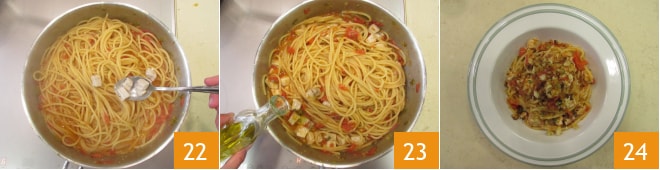 Adicione o peixe-espada para um rápido salteado 22, regue com um fio de óleo cru antes de servir 23. Assim, os spaghettoni estão prontos 24.