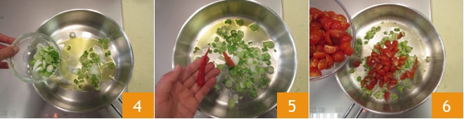 Coloque a cebolinha numa panela com um fundo de óleo 4, adicione a pimenta 5 e deixe murchar em fogo médio por cerca de 5 minutos. Neste ponto, você pode adicionar os tomates à panela 6.