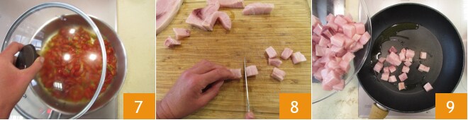 Cubra com a tampa e deixe cozinhar por cerca de 20 minutos, mexendo de vez em quando 7. Enquanto isso, corte o peixe-espada em cubos de cerca de 2 cm 8 e coloque-os em uma panela quente com um fio de óleo 9.