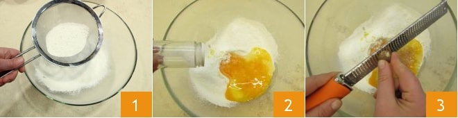Para preparar os spätzle, peneire a farinha em uma tigela 1, adicione os ovos, sal 2 e aromatize com noz-moscada 3,