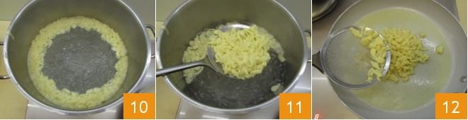 Quando os spätzle começarem a ressurgir à superfície 10, retire-os com uma escumadeira 11 e transfira-os diretamente para a frigideira onde você derreteu a manteiga 12