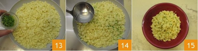 Adicione a cebolinha picada 13, se ficarem muito secos, despeje uma concha de água do cozimento 14, salteie para dar sabor e sirva seus spätzle bem quentes 15!