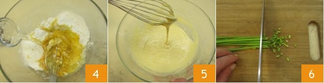 por fim, despeje a água em temperatura ambiente em fio (se você não preparar os spätzle com o utensílio apropriado, mas sim com um espremedor de batatas, use menos água para obter uma massa mais consistente e menos líquida) 4; misture bem com um batedor para incorporar os ingredientes e obter uma mistura lisa e sem grumos, que permanecerá bastante líquida 5. Enquanto isso, leve uma panela cheia de água para ferver, adicione sal à água fervente: isso será necessário para cozinhar os spatzle. Enquanto isso, prepare o tempero porque os spatzle cozinham rapidamente: lave as hastes de cebolinha e pique-as 6.