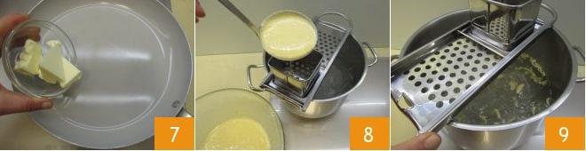 Em uma frigideira grande, derreta a manteiga 7. Enquanto isso, pegue o Spätzlehobel, o instrumento para criar os spatzle; se você não o tiver, pode usar um espremedor de batatas. Coloque o Spätzlehobel sobre a panela com a água fervente, despeje uma concha de massa no espaço apropriado 8, deslize o utensílio para frente e para trás para fazer os spatzle recém-formados caírem diretamente na panela; assim que entrarem em contato com a água fervente, os spatzle cozinharão em poucos instantes 9, como acontece com os nhoques.