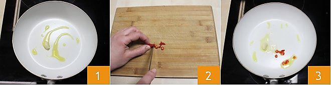Para preparar as spianatine com camarões alho óleo e pimenta, despeje um fio de azeite de oliva extra virgem em uma frigideira antiaderente e frite um dente de alho previamente descascado 1. Enquanto isso, pegue a pimenta fresca e, após lavá-la, fatie-a finamente 2, então frite-a na frigideira junto com o alho 3.