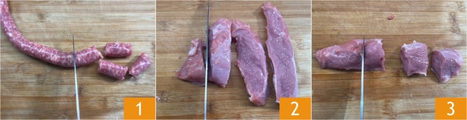 Para preparar os espetinhos de carne, primeiro retire a pele da linguiça e corte-a em pedaços de cerca de 3 cm 1. Corte a polpa de vitela primeiro em fatias 2 e depois em cubos de 3 cm de lado 3.