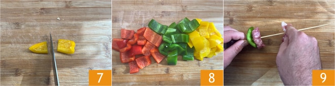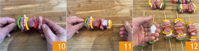Continue alternando as cores dos pimentões e a carne 10. Feche o espetinho com um pedaço de pimentão 11 e salgue 12.
