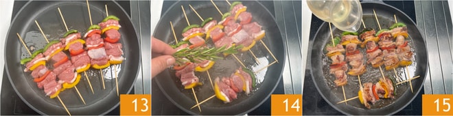 Em uma frigideira, aqueça um fio de óleo de girassol, depois coloque os espetinhos 13 e doure-os de todos os lados. Adicione o alecrim 14 e borrife com vinho branco 15.
