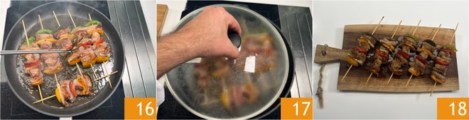 Assim que toda a parte alcoólica evaporar, remova o alecrim 16 e cubra com uma tampa 17. Abaixe o fogo ao mínimo e cozinhe por 15 minutos. Seus espetinhos de carne estão prontos para serem saboreados 18!