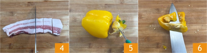 Corte também o bacon em pedaços de 3 cm 4. Passe para os pimentões: remova o talo 5 e os filamentos internos 6.