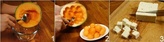 Corte o melão em duas partes iguais, seguindo as linhas naturais que o sulcam e retire as sementes internas ajudando-se com uma colher para removê-las 1; com uma boleadora em forma de semiesfera, faça várias bolinhas de melão 2. Corte o feta em quadrados de cerca de 2 cm de lado 3.