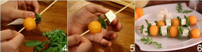 Pegue 12 palitos para espetinhos e comece espetando em um deles uma bolinha de melão, seguida por um par de folhas de rúcula dobradas ao meio 4 e depois um quadradinho de feta 5 seguido por duas folhas de rúcula dobradas. Volte a espetar uma bolinha de melão e complete assim a sequência inicial até ter no palito três bolinhas de melão e três quadradinhos de feta intercalados com folhinhas de rúcula. Proceda desta forma até fazer ao todo 12 espetinhos 6. Se sobrar algum ingrediente, você pode usá-lo para decorar o prato de servir onde colocará os espetinhos (pelo menos 3 por pessoa se for entrada).