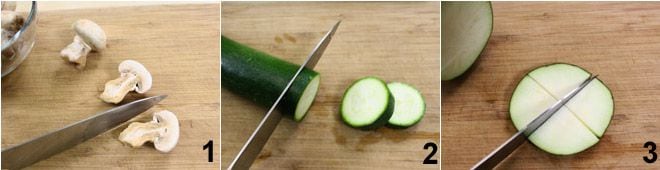 Para preparar os espetinhos de vegetais, comece limpando os cogumelos e cortando-os ao meio 1, lave todos os vegetais e corte a abobrinha em rodelas de 1 cm 2, fatie a berinjela e divida cada fatia em quatro partes 3, sempre com espessura de 1 cm,
