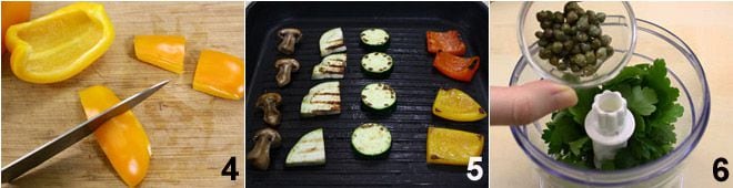 corte também os pimentões em retângulos proporcionais aos outros vegetais 4. Pincele uma grelha grande com óleo e cozinhe os vegetais em fogo alto 5. Enquanto isso, prepare o molho colocando no processador as folhas de salsa, as alcaparras 6, o óleo,