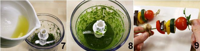 o suco de limão 7 e o alho, triture todos os ingredientes até obter uma mistura cremosa 8. Agora comece a montar os espetinhos inserindo uma folha de salsa e depois o restante dos componentes alternando-os: os tomates, as abobrinhas, os pimentões, as berinjelas, os cogumelos e os pedacinhos de muçarela. Coloque os espetinhos em um prato de servir e acompanhe-os com o molho de salsa e alcaparras.