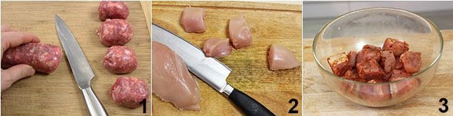 Para preparar os espetinhos animados à cerveja, comece preparando todos os ingredientes que você precisará para montar os espetinhos. Corte a linguiça em 8 pedaços 1 de forma que fiquem mais ou menos do mesmo tamanho da carne (cerca de 45 gr para linguiças bastante grossas tipo mantovana). Corte 8 cubos de frango de cerca de 35 gr cada 2 e 16 cubos de carne de porco do mesmo tamanho. Coloque apenas os pedaços de porco em uma tigela e polvilhe-os com a páprica para que adira bem à carne 3.