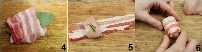 Corte o bacon de porco de forma a obter 8 pedaços que possam ser dobrados como um livro (cerca de 20 gr) e coloque uma folha de sálvia no meio 4. Pegue um pedaço de carne de frango, coloque uma pontinha de alecrim por cima 5 e envolva-o completamente com uma fatia de bacon defumado 6: prossiga assim com todos os outros cubos de carne de frango.