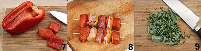 Lave, seque, elimine as sementes e os filamentos internos, e corte os pimentões em tiras, obtendo deles 16 quadrados vermelhos 7 e 16 amarelos (ou verdes) com lado de cerca de 3,5 cm. Pegue espetinhos de madeira (ou aço) e comece a espetar um pedaço de carne de porco, depois um quadrado de pimentão vermelho, a carne de frango envolta no bacon, um quadrado de pimentão amarelo (ou verde), a linguiça, um quadrado de pimentão vermelho, o bacon dobrado com sálvia, mais uma tira de pimentão amarelo e por último um pedaço de carne de porco 8. Agora, basta fazer mais 7 idênticos com os ingredientes restantes à sua disposição. Pique as ervas aromáticas 9