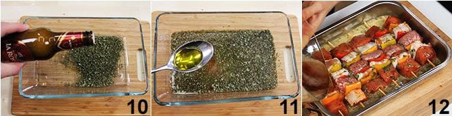 e prepare agora a marinada para os espetinhos: em uma tigela coloque o picadinho de alecrim e sálvia, despeje a cerveja vermelha 10, adicione o óleo 11, o suco e a casca ralada de limão, sal e pimenta. Misture bem, despeje o líquido sobre os espetinhos 12 e deixe marinar por pelo menos meia hora.