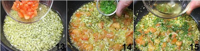 Enquanto isso, prepare o molho de cerveja: pique a cebola, corte o tomate em pedacinhos, a pimenta verde e pique o alecrim e o tomilho. Em uma frigideira, doure a cebola com o azeite de oliva, junte os tomates 13 e, um de cada vez, todos os ingredientes: a pimenta verde 14, as folhas de manjericão, o alecrim e o tomilho picados, o vinagre de arroz (ou maçã) 15,