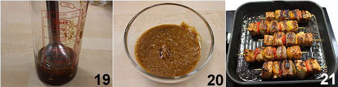 Neste ponto, transfira a mistura para um copo e bata tudo com um mixer de mão 19. Coloque o molho de volta no fogo baixo para reduzir até obter um molho bem espesso 20, que você ajustará o sal, se necessário, e reservará. Retire os espetinhos da marinada e cozinhe-os em uma grelha ou chapa até o ponto desejado, cerca de 20 minutos 21, pincelando-os durante o cozimento com a marinada restante. Sirva os espetinhos animados regados com o molho de cerveja obtido ou leve este último em uma molheira, deixando que seus convidados usem à vontade!