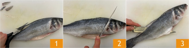 Para preparar o robalo ao papelote, comece pela Como limpar o robalo (spigola). Corte as barbatanas 1, depois descame sob um jato de água corrente com o utensílio apropriado ou com o dorso de uma faca. Corte ao longo do ventre, retire as vísceras e enxágue novamente. Faça um corte diagonal, logo após as guelras, que comece no dorso e se una ao corte feito anteriormente no ventre 2. Corte a cauda e a parte dorsal do peixe seguindo a coluna vertebral 3, uma vez obtido o primeiro filé, prossiga da mesma forma para o segundo.