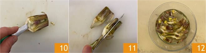 Corte-as ao meio e retire a penugem interna 10, depois corte em quartos 11. À medida que forem sendo limpas, mergulhe-as em água acidulada 12.