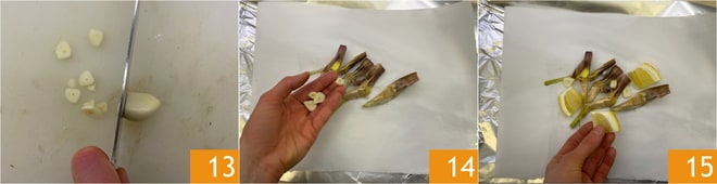Fatie o alho 13. Corte 4 folhas de papel manteiga e sobreponha-as a 4 folhas de papel alumínio. No centro, coloque as alcachofras, o alho 14 e algumas fatias de limão 15.