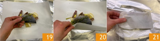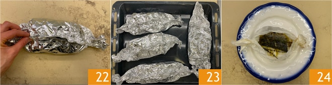 Feche o papel alumínio como uma bala 22. Coloque os pacotes em uma assadeira 23 e asse em forno estático, pré-aquecido, a 200°C por 20-25 minutos. O robalo ao papelote está pronto para ser servido diretamente no papelote 24.