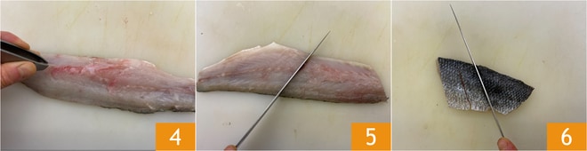 Retire eventuais espinhas e impurezas 4. Corte os filés em losangos 5 e depois corte a pele 6. Reserve.
