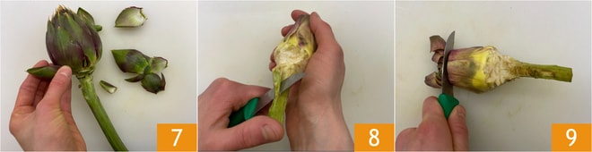 Agora dedique-se à Como limpar alcachofras. Retire as folhas externas e mais duras 7. Descasque o caule 8 e em seguida retire as pontas com um corte reto 9.