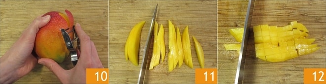 Enquanto isso, descasque a manga 10 e corte-a primeiro em fatias 11 e depois em cubinhos 12.
