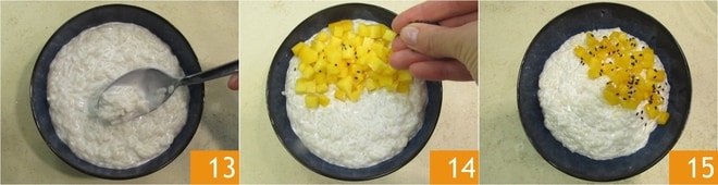 Quando o arroz estiver pronto, coloque-o em uma tigela e deixe amornar 13, depois guarneça com a manga e as sementes de gergelim 14. Seu sticky rice está pronto para ser servido morno ou frio 15!