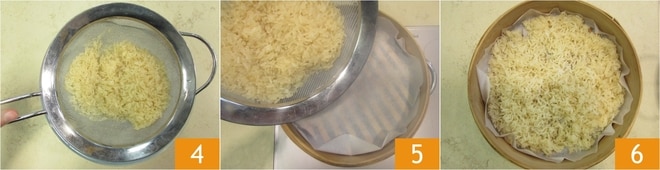 Escorra o arroz 4 e coloque-o na panela de vapor 5, depois feche com a tampa e cozinhe por 15 minutos 6.