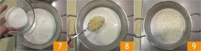 Enquanto isso, aqueça o leite de coco e o açúcar em uma panelinha 7. Uma vez cozido, adicione também o arroz 8 e leve a mistura para ferver novamente. Neste ponto, abaixe o fogo e cozinhe por 10 minutos, mexendo de vez em quando 9. Você deve obter uma consistência cremosa.
