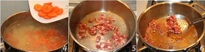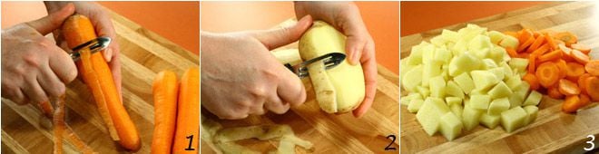 Descasque as cenouras 1 e as batatas 2; corte as batatas em pedaços e as cenouras em rodelas 3, depois cozinhe-as em água fervente com sal 4.
