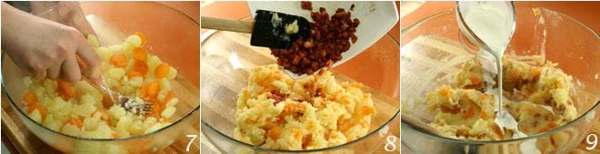 Quando os vegetais estiverem prontos para serem amassados, escorra bem e coloque-os em uma tigela; com a ajuda de um garfo, amasse-os 7 até transformá-los em purê. Adicione a manteiga, misture e depois acrescente o bacon crocante 8, adicione a noz-moscada ralada, a pimenta e, por último, adicione o creme de leite 9; depois de misturar bem todos os ingredientes, sirva o stoemp com cenouras imediatamente.